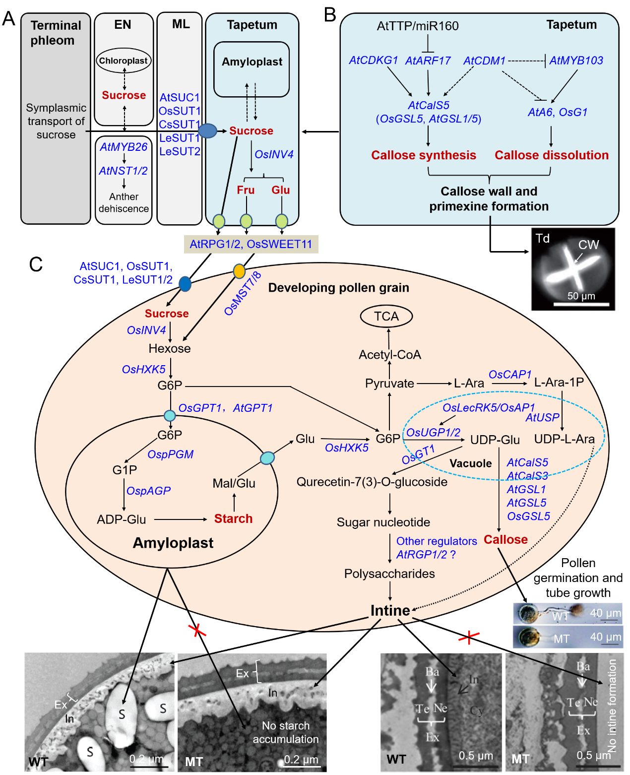 糖代谢在植物雄性生殖发育中起着重要作用。在植物中,糖类包括蔗糖、葡萄糖、果糖、海藻糖及其衍生物,如胼胝质、纤维素、半纤维素、果胶、淀粉等,是植物细胞的基本能量来源和结构成分。高温、低温、干旱等非生物逆境往往导致作物糖代谢紊乱、花粉活力下降,从而造成大幅度减产。在花药和花粉发育过程中糖代谢基因的功能缺陷,往往导致细胞核雄性不育(GMS)。因此,解析糖代谢参与植物花粉发育和雄性不育的分子机制,具有重要理论意义和应用价值。