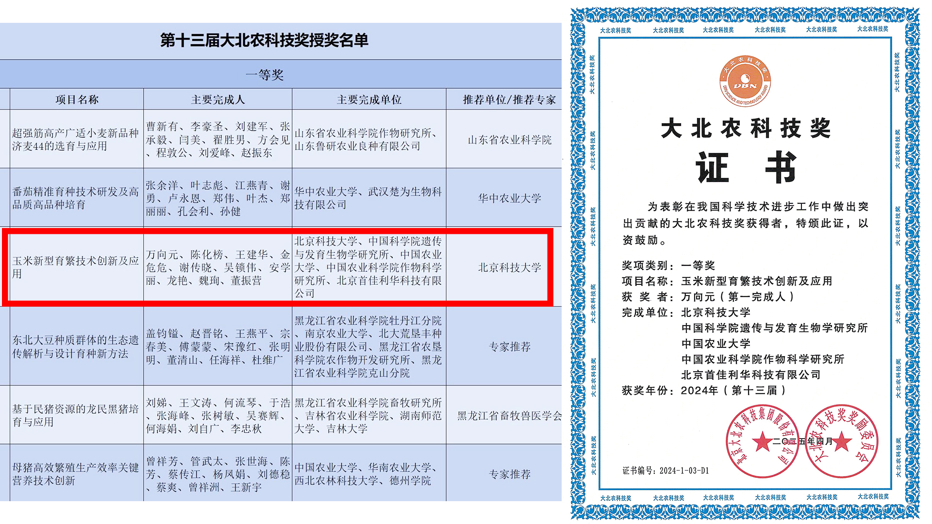 由我校万向元教授主持完成的《玉米新型育繁技术创新及应用》项目成果荣获第十三届大北农科技奖一等奖。该成果历经13年联合攻关,创新地提出了玉米雄性不育及无隔离母本系的生物育种新思路;发掘玉米优异基因,发明整合分子设计育种技术体系,精准创制优异亲本系;在此基础上,培育并审定系列玉米新品种,率先尝试开展不育化和无隔离制种;此外,创新玉米种子活力检测和生产理论,首创高活力种子生产技术体系,并应用于玉米杂交种生产。该成果为解决我国玉米生产“三缺两低”(缺乏可用的母本不育系、优异父本系和突破性杂交种,及种子生产效率和种子活力偏低)的难题提供系统解决方案;相关新品种和种子生产技术累计推广应用超过1000万亩,直接经济效益超10亿元,成为科技赋能作物种业的生动实践。我校参与完成人还有吴锁伟教授、安学丽教授、龙艳教授、魏珣教授和董振营副教授。