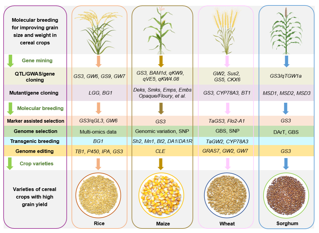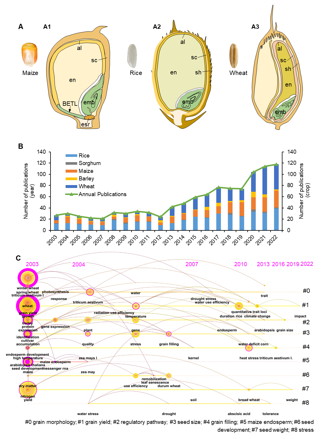 玉米、水稻、小麦、高粱和大麦等禾本科作物是全球重要的粮食作物。籽粒大小和重量是作物产量的主要决定因素。尽管对禾本科作物籽粒大小、重量的基因挖掘和分子机制的研究不断涌现,但对其潜在的分子机制及其育种应用的系统性综述还不多,无法全面了解禾本科作物籽粒大小和重量研究的总体现状、热点和趋势。