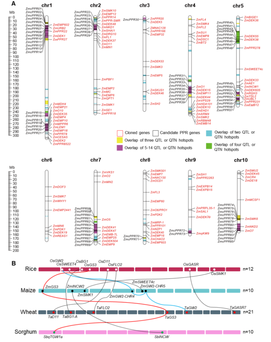 鉴于不同禾本科作物籽粒大小和重量相关基因挖掘和机制解析的研究进展不一致,本文提出了利用已发表相关遗传信息和近缘作物基因组信息来进一步挖掘和解析调控基因的方法,并以玉米为例进行了展示,即收集并分析了玉米已发表文献中的籽粒大小和重量的遗传热点区间,并列出了热点区域内所有的PPR基因和候选基因(图7A);同时,例证了在不同禾本科作物中已克隆的控制籽粒大小和重量基因的保守性和共线性(图7B)。