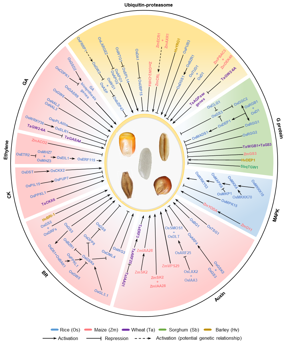 针对调控籽粒大小和重量的不同调控途径,我们对8种主要的调控途径及其涉及到的基因进行了总结,包括:泛素-蛋白酶体降解系统、G蛋白信号、丝裂原活化蛋白激酶信号以及已知的5种植物激素信号途径(图3)。