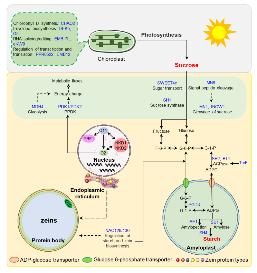 玉米等禾本科作物授粉后,经过受精,籽粒进入快速膨大和淀粉填充阶段,该阶段的营养物质积累与产量息息相关,并涉及到多个生理生化过程,即从光合作用到产物运输、再到物质积累,整个途径由多种基因共同作用调控。本文以玉米为例列举了光合作用以及物质运输对于籽粒大小和重量形成的调控作用(图6)。