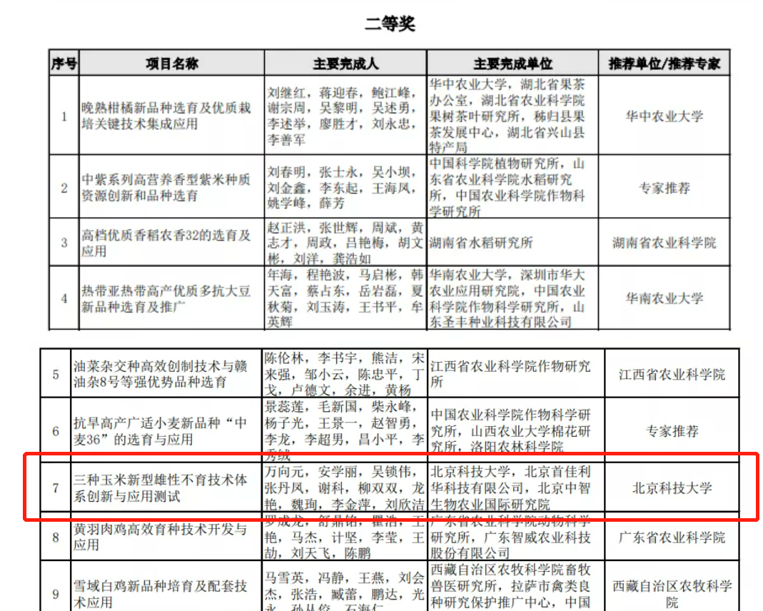 在2022年1月14日公布的第十二届大北农科技奖评选结果中,以欧冠官网入口、北京首佳利华科技有限公司和北京中智生物农业国际研究院为主要完成单位申报的“三种玉米新型雄性不育技术体系创新与应用测试”项目荣获大北农科技奖二等奖。