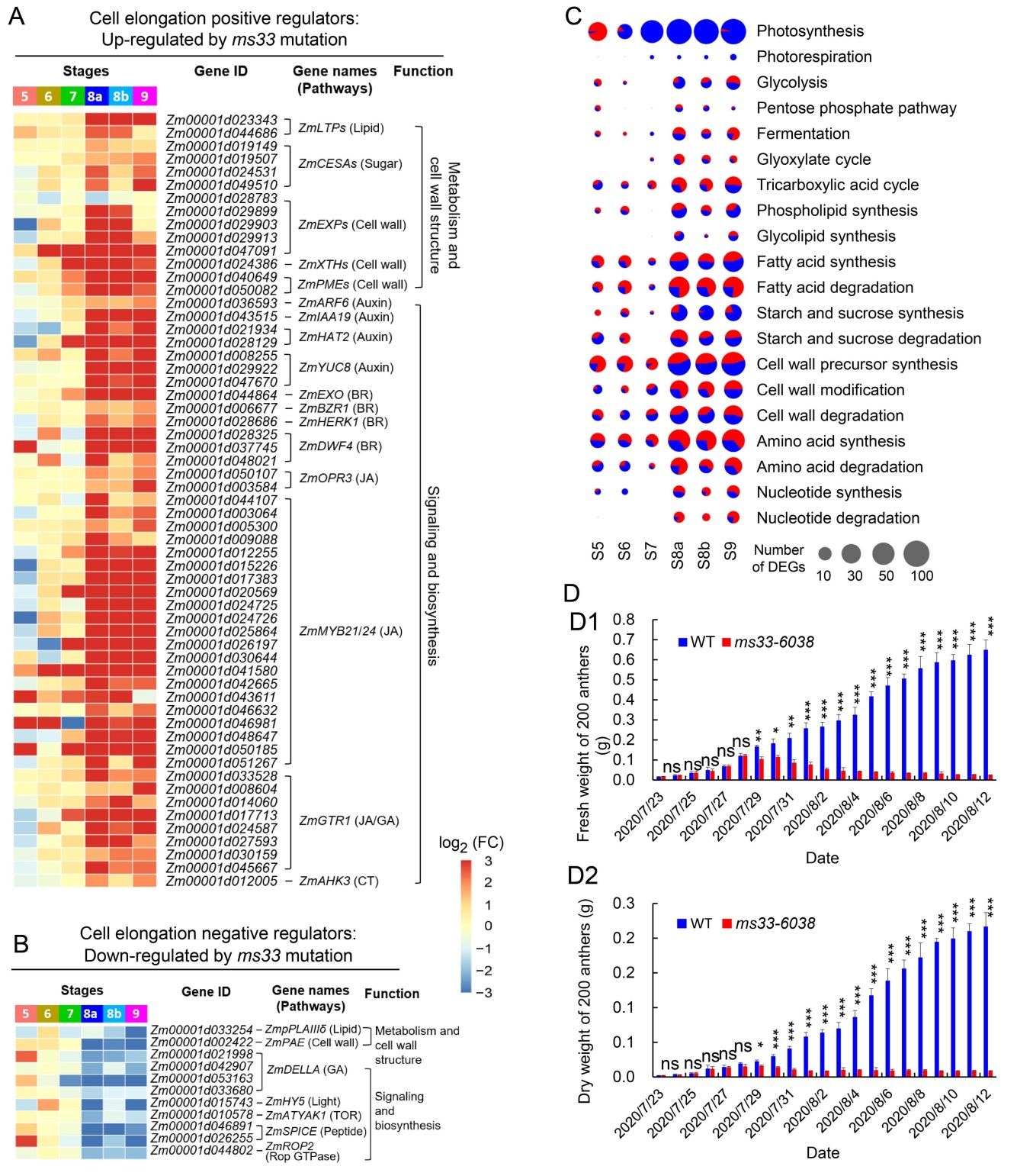图2:ms33-6038花药中细胞伸长基因被激活但代谢紊乱阻止细胞伸长和花药生长