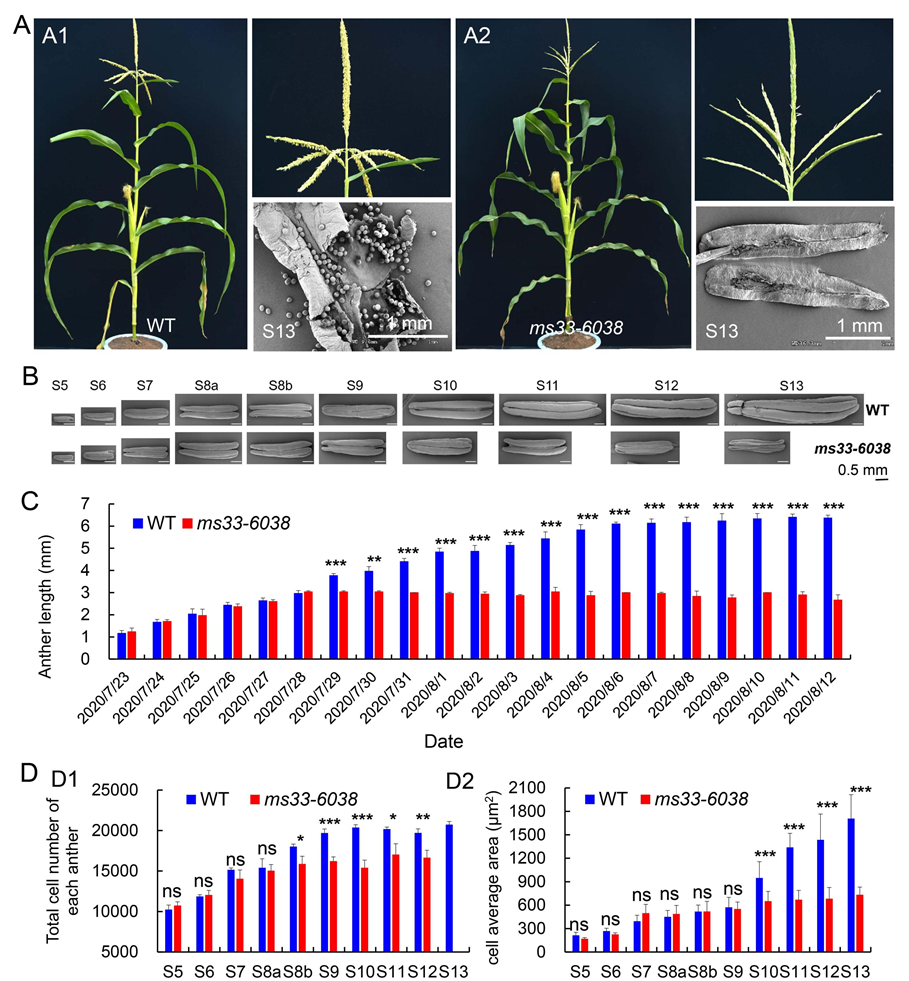 图1:ms33-6038突变导致花药伸长在S8b-S9时期被迫停滞
