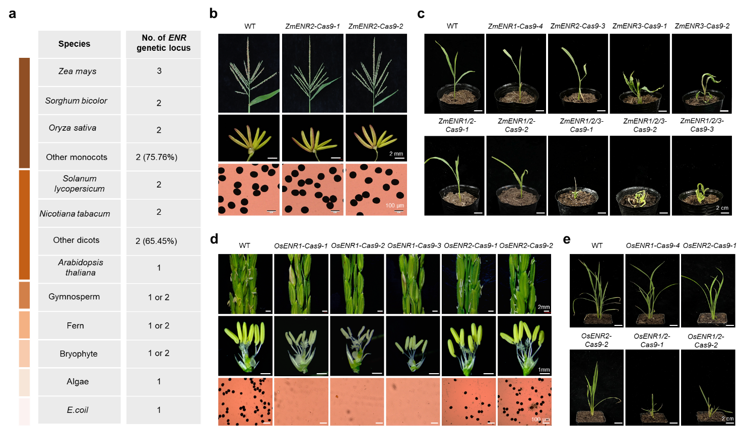 此外,对ZmENR1在开花植物中的进化关系进行了研究。序列比对和系统进化树分析发现,大多数植物在从低等到高等的进化过程中ENR基因数量发生了复制和丢失。拟南芥、水稻、玉米分别包含1、2、3个ENR基因。为了研究不同植物中的ENR基因功能,基于CRISPR/Cas9介导的基因编辑技术,创制了这些基因的单突、双突及三突变体。ZmENR2基因突变不影响育性,ZmENR3突变造成植株矮化叶片发育异常,OsENR1突变表现为雄性不育,OsENR2突变不影响育性,玉米三突变体和水稻双突变体表现出与拟南芥AtMOD1(ENR同源基因)突变体一致表型,即叶片发育异常、植株矮化,最终植株死亡(图4),说明ENR1是高等植物(如玉米、水稻)中新进化的基因,特异性调节雄性育性。