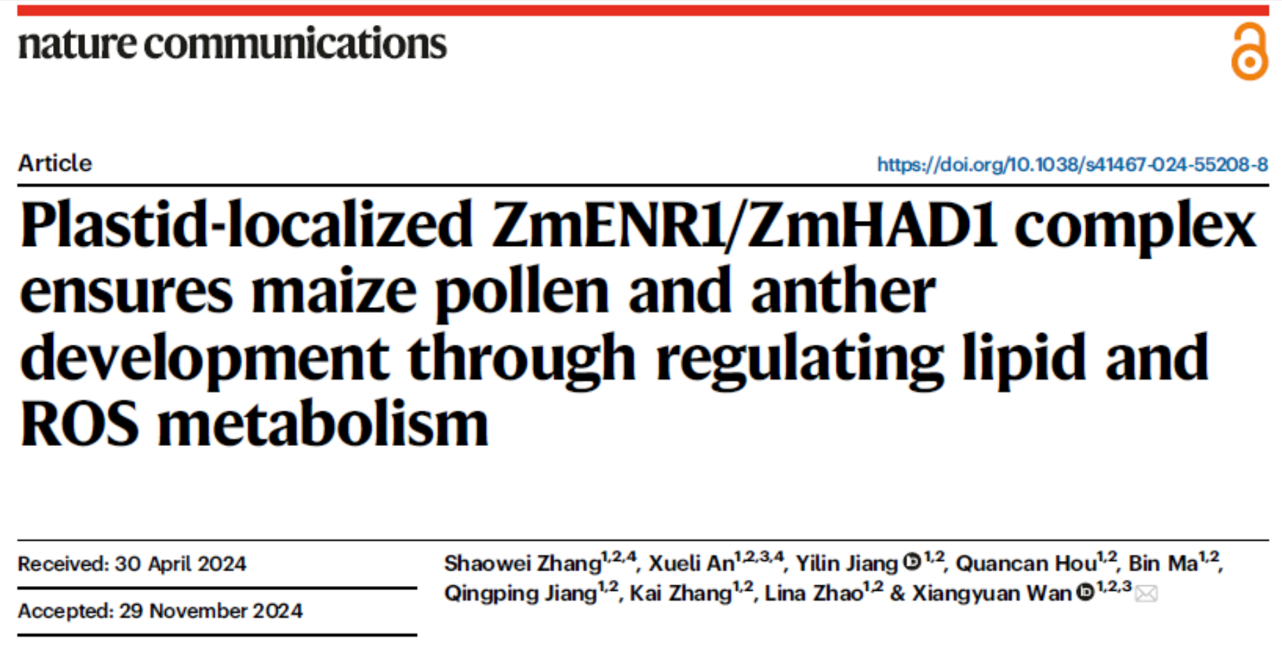 2024年12月30日,欧冠官网入口生物农业研究院、北京中智生物农业国际研究院万向元团队在Nature Communications上在线发表了题为“Plastid-localized ZmENR1/ZmHAD1 complex ensures maize pollen and anther development through regulating lipid and ROS metabolism”的研究论文。该研究通过基因定位,克隆了玉米雄性不育基因ZmENR1(编码质体定位的烯酰基-ACP还原酶),该基因为植物中发现的第1个参与脂肪酸从头合成的雄性不育基因;进一步综合利用遗传学、细胞学、分子生物学和多组学等技术揭示了受ZmMS1介导的反馈抑制环[2]调控的ZmENR1/ZmHAD1复合体,通过影响脂和活性氧代谢进而影响雄花发育的分子机制;同时研究了ENRs基因在不同植物中的功能保守性和差异性,加深了对植物雄花发育中脂代谢的认识。
