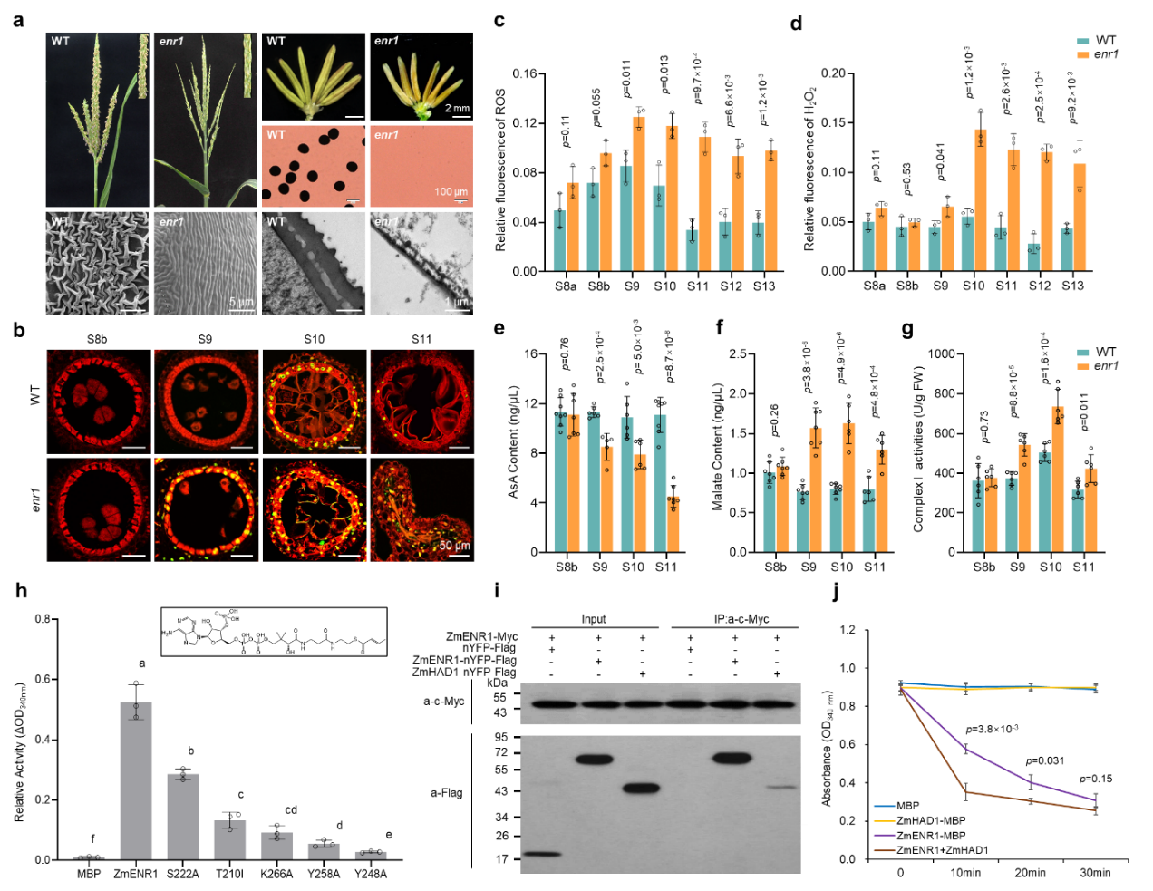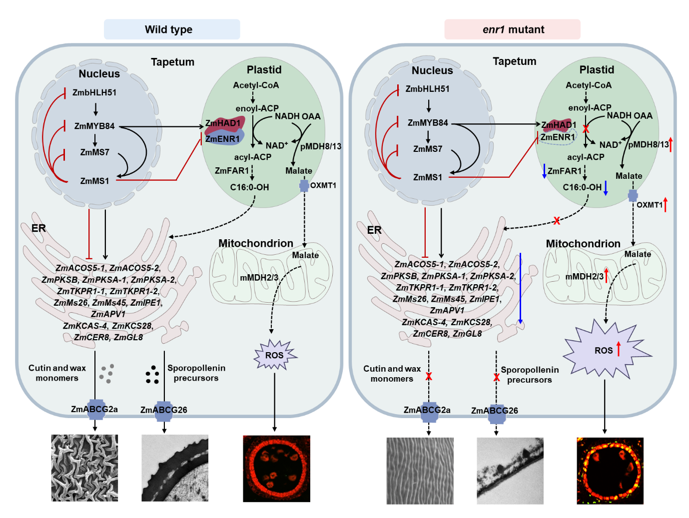 该团队利用EMS诱变获得一个花药角质层和花粉外壁均变薄的玉米雄性不育突变体enr1,克隆了ZmENR1基因,其在花药发育的S7-S9时期的绒毡层中特异表达;ZmENR1突变造成苹果酸介导的ROS产生途径被激活,苹果酸含量升高,线粒体复合物I活性增强,ROS清除剂抗坏血酸含量降低,导致ROS和H2O2含量升高,花药绒毡层提早降解;ZmENR1编码质体定位的烯酰基-ACP还原酶,其活性依赖于5个保守的催化位点(TSYYK);通过IP-MS,筛选到一个与ZmENR1互作的蛋白β-羟酰基-ACP脱水酶(ZmHAD1),进一步通过Co-IP等分子实验发现ZmENR1与ZmHAD1形成异源二聚体,以提高质体脂肪酸生物合成的效率(图1)。
