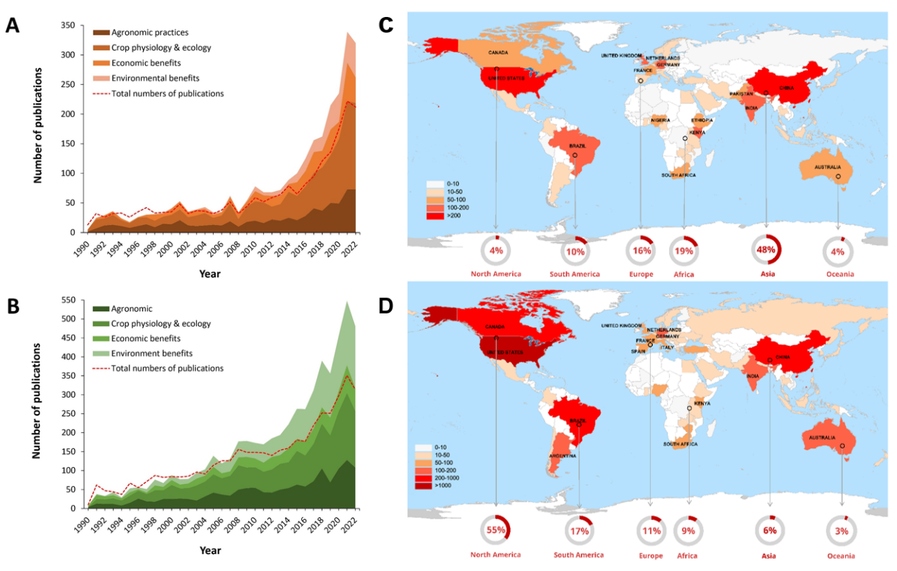 图1:1990-2022年玉米-豆科作物间作和轮作研究的发展趋势和全球特征