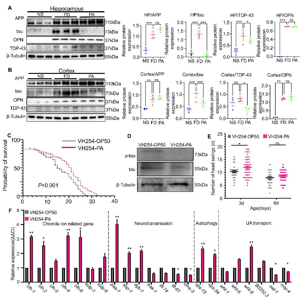 随后,作者通过WB,RT-qPCR等实验证明了PA的摄入可以降低小鼠海马和前额叶中tau蛋白的含量,然而对APP(Aβ蛋白前体)蛋白的影响却不显著。其次,在过表达p-tau蛋白的线虫中PA可以延长线虫的生存时间,并降低全身痴呆相关tau和p-tau蛋白的表达,并通过相关铁、磷酸转运体的转运来完成以上机制(图2)。