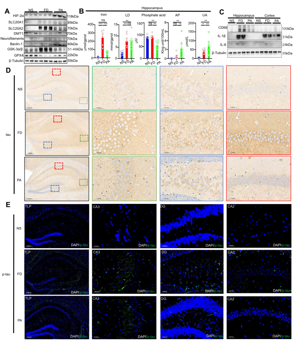 后续在海马和前额叶相关机制的研究中,文章发现PA 的干预会阻止前额叶中铁浓度的升高,增强了 AP 活性和 尿酸UA 水平,降低了铁转运蛋白DMT1、磷酸转运体slc20a1、slc20a2和缺氧诱导因子HIF-2α的蛋白水平。而在海马中PA可减少tau蛋白免疫反应的聚集,尤其是消除p-tau免疫反应,与对照组小鼠相比,Fe-die(FD)小鼠海马CA1、CA3和DG层的tau和p-tau免疫反应区增大,而灌喂PA可减少tau蛋白免疫反应的聚集,尤其是消除p-tau免疫反应。与 FD组的海马相比,高铁饮食条件下炎症 IL-1β 和 IL-6 增加,但PA海马中的 CD68 蛋白减少,但前额叶皮质中的 CD68 无显著变化。以上数据表明PA的治疗可能呈现一定的组织特异性(图3)。
