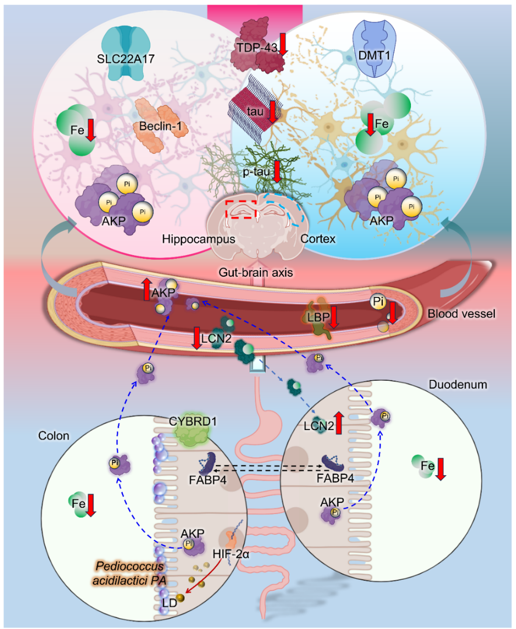 阿尔兹海默症(AD)是当今世界上最棘手的老年病之一,其病理上发病特征是与 Aβ 和 tau 蛋白的非正常聚集和修饰。越来越多的证据表明脑铁积累是阿尔茨海默病的一个重要特征。然而,铁介导的肠道-大脑轴对阿尔茨海默病的作用和机制仍不清楚。其次,肠道又被称为人体的“第二大脑”,广泛而多样的肠道菌群调控与人脑的代谢和生理活动密不可分,其可以调控肠道菌群从而改善宿主身体状态。当前,益生菌作为“活的微生物”已经受到食品界的重视,开发特种益生菌食品成为“吃饱”到“吃好”的关键途径之一。