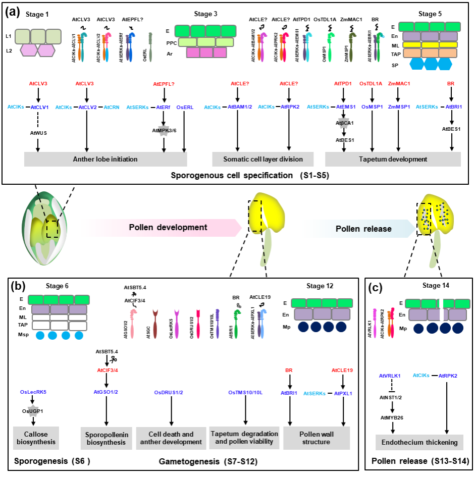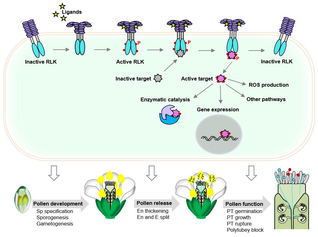 文章首先概述了RLK信号转导过程及其在雄性生殖的三个阶段(花粉发育、花粉释放、花粉功能)中的生物学功能。RLK通过其胞外域识别信号分子,然后激活其胞内的激酶域,激活的激酶域可以磷酸化靶蛋白,引起胞内的一系列生物化学事件,比如,酶促反应、基因表达、ROS产生,以此将胞外信号传递至细胞内部,调控植物的雄性生殖发育(图1)。