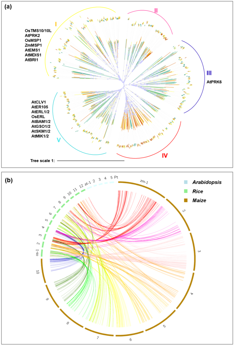 图5. 拟南芥、水稻和玉米RLK基因的进化分析和共线性分析
