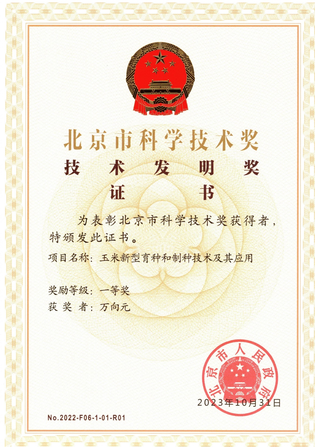 2023年10月31日,北京市人民政府发布《关于2022年度北京市科学技术奖励的决定》,欧冠万向元教授主持完成的“玉米新型育种和制种技术及其应用”项目,荣获北京市技术发明奖一等奖。