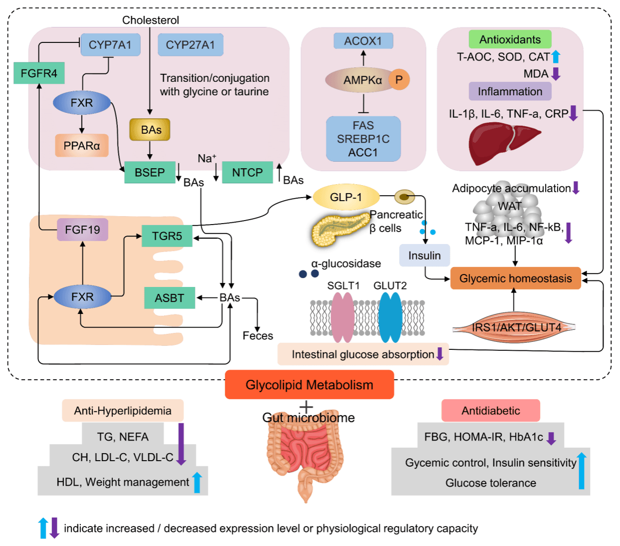 膳食纤维和多酚还可以在重塑肠道菌群的过程中改善脂糖代谢。在脂代谢方面,膳食纤维可以调节脂类物质分解和合成相关基因表达,预防肝脏炎症;多酚可以调节胆汁酸代谢相关基因表达,缓解肝脏胆固醇压力(图3)。在糖代谢方面,膳食纤维可以通过调节肠道菌群缓解机体炎症,进而减轻胰岛素抵抗;通过调节两种肠激素GLP-1PYY的分泌,影响葡萄糖吸收;通过激活FXR介导的TRG5/GLP-1信号通路,改善肝脏葡萄糖和胰岛素敏感性。结合酚类物质可以强化米糠膳食纤维的降血糖作用(图3)。