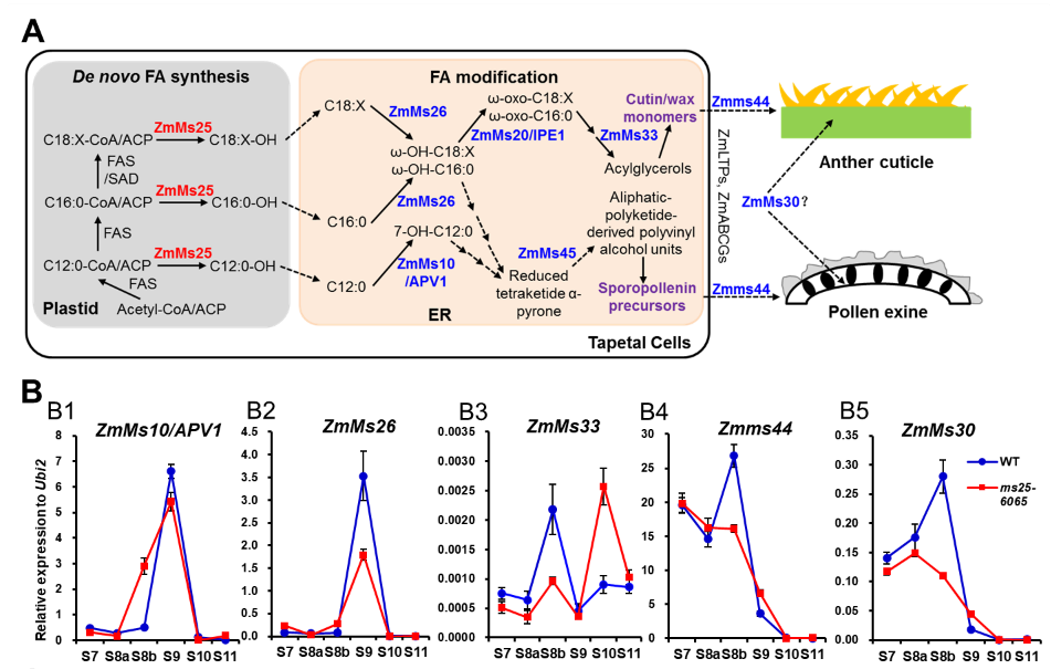 ZmMs25在花药单核小孢子期(S9)高表达;花药发育关键转录因子ZmMYB84 (Jiang et al., 2021) 直接结合ZmMs25启动子并激活其表达1)。此外,ZmMs25功能缺失显著影响其4个同源FAR基因和5个已报道的脂代谢雄性不育基因(ZmMs10ZmMs26ZmMs30ZmMs33Zmms44)在玉米花药中的表达,表明ZmMs25不仅参与花药脂代谢和花粉发育,而且对其它脂代谢基因有直接或间接的影响2)。另外,ZmMs25及其同源基因在植物进化中相对保守,暗示了其在玉米和其它作物的不育化育种和杂交制种中具有潜在的应用价值。