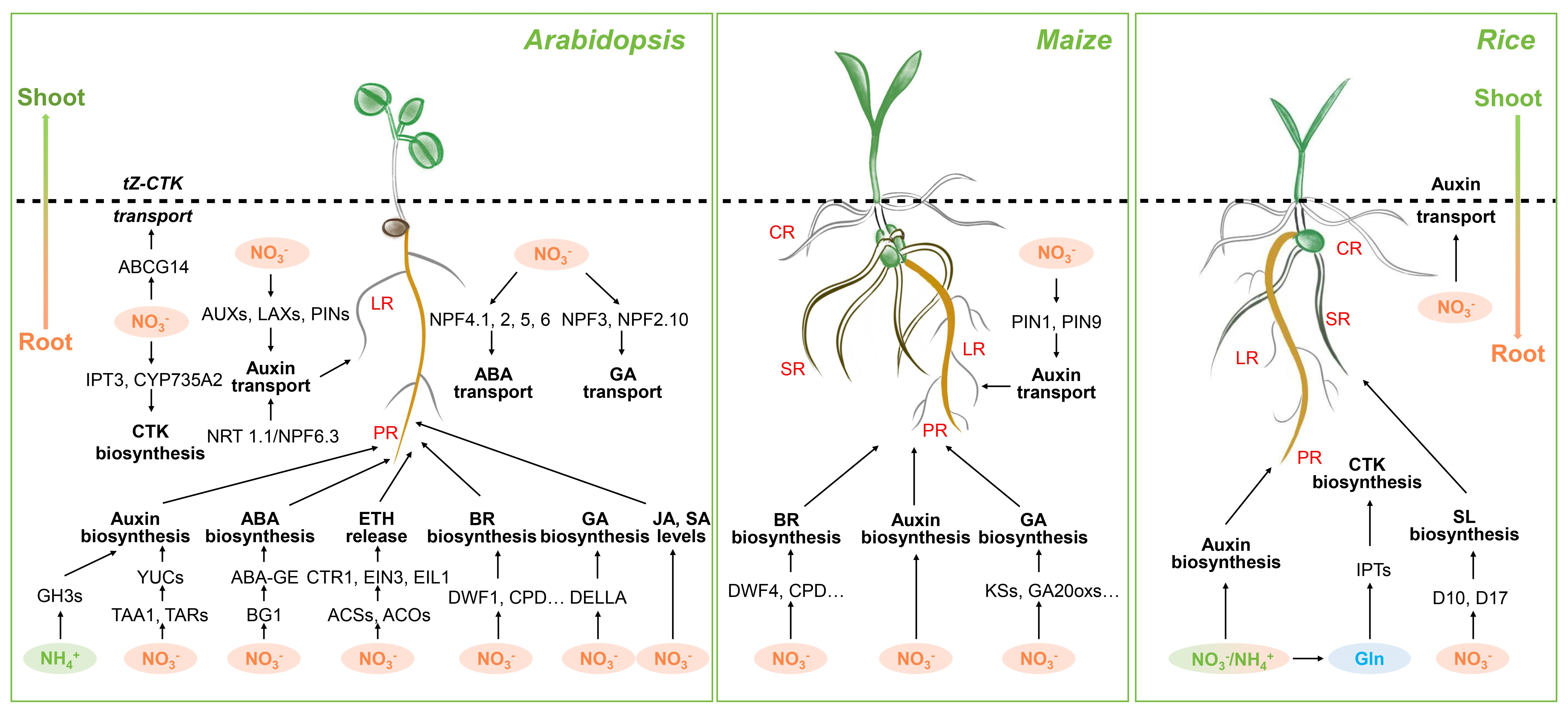 首先,该论文全面分析了在不同物种中不同形式的氮(包括硝酸盐NO3-和铵盐NH4+)对生长素(auxin)、细胞分裂素(CTK)、脱落酸(ABA)、乙烯(ETH)、赤霉素(GA)、油菜素内酯(BR)、茉莉酸甲酯(JA)、水杨酸(SA)和独脚金内酯(SL)等九类激素合成和转运的影响,主要通过调控相应激素合成和转运的基因,并在不同物种中形成特定的调控网络(图1)。