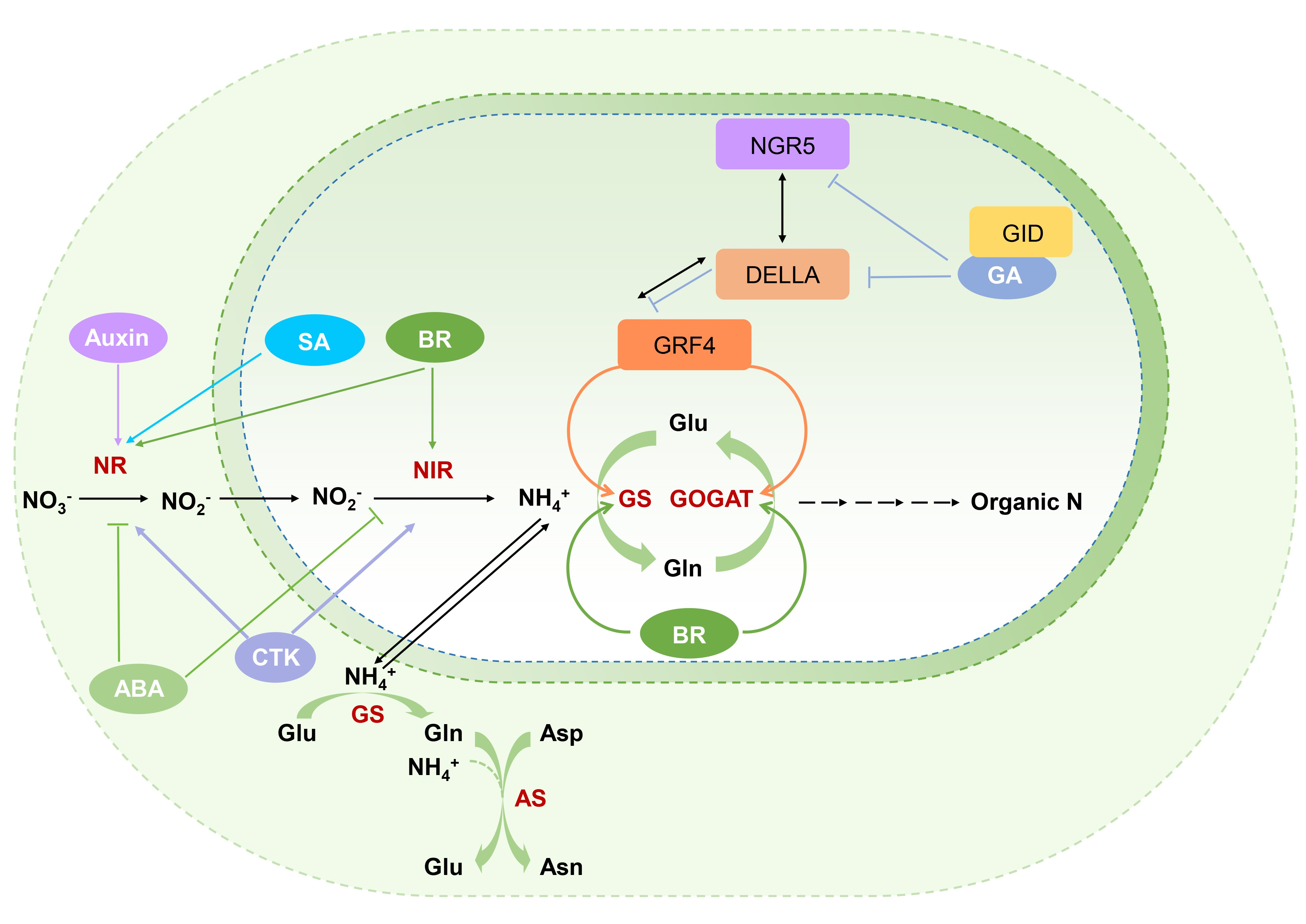 NO3-被根吸收后,通过硝酸还原酶(NR)和亚硝酸还原酶(NIR)转化为NH4+,通过硝酸还原反应转化的NH4+和被根系直接吸收的NH4+再经过谷氨酸/谷氨酰胺(GS/GOGAT)循环同化为有机氮。此外,谷氨酰胺(Gln)或NH4+的酰胺基团经过天冬酰胺合成酶(AS)作用转移到天冬氨酸(Asp),形成天冬酰胺(Asn)和谷氨酸(Glu)。植物激素能够调控编码NR、NIR、GS和GOGAT的基因及相应酶的活性,进而调控氮同化(图4)。Auxin和CTK正调控NR表达、蛋白水平及酶活;CTK正调控NIR表达,而ABA负调控NR和NIR表达;BR调控NR、NIR、GS和GOGAT活性;SA通过影响NR活性调控氮同化;GA-GID1-NGR5-DELLA-GRF4信号传导模块参与调控氮同化。