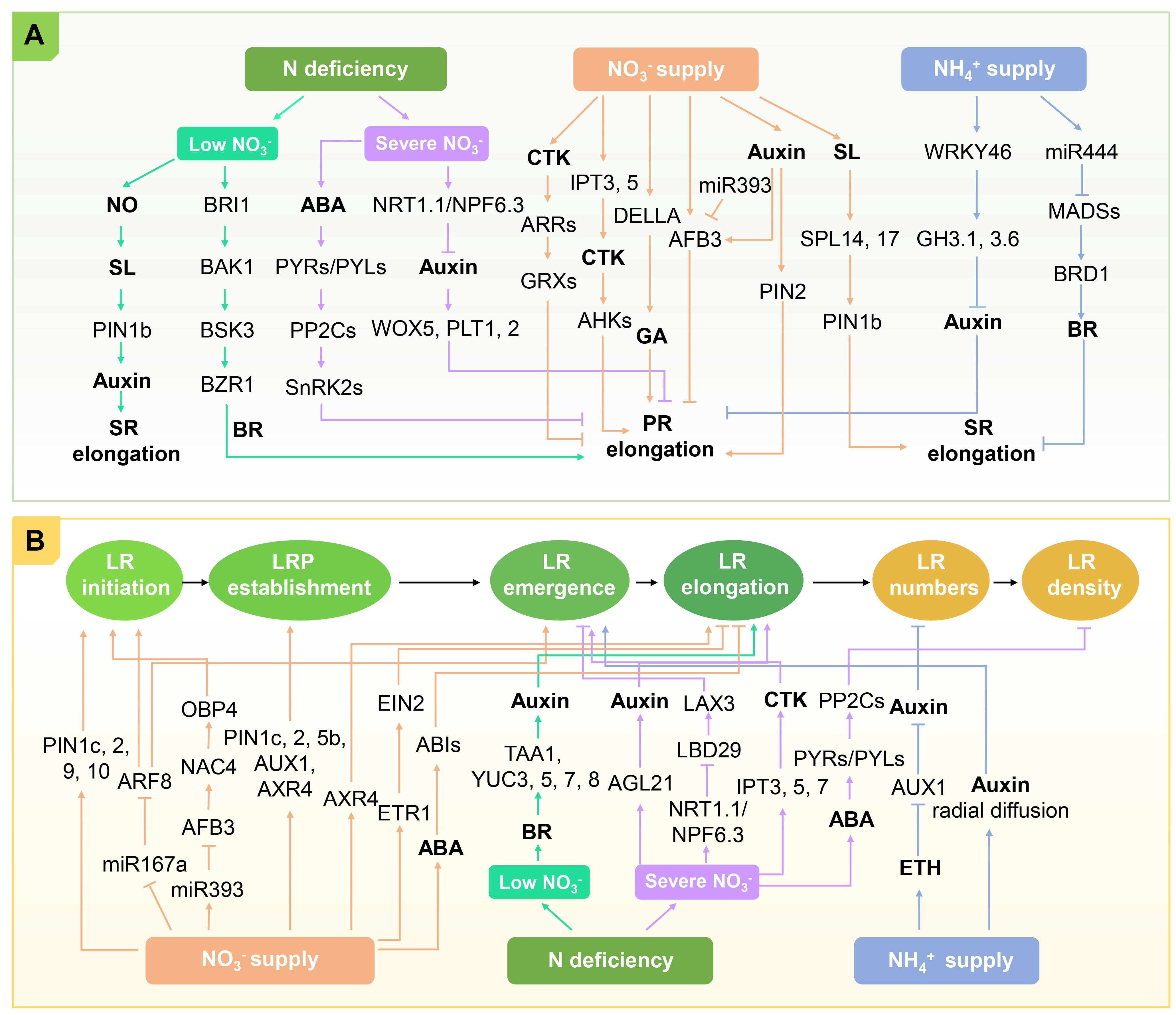 其次,该论文阐述了在响应不同形式和浓度的氮素过程中,植物激素对根系构型的调控机制(图2)。根系是水分和养分吸收的主要器官,根系构型的改变(主根、种子根的伸长及侧根的发育)对植物高效吸收氮素营养具有重要作用。在响应氮缺乏过程中,auxin调控主根、种子根、侧根的伸长及侧根发生;BR调控主根的伸长且其位于auxin上游调控侧根的伸长;SL和auxin互作调控种子根的伸长;CTK参与调控侧根发生;ABA负调控主根的伸长和侧根密度。在响应NO3-供给过程中,auxin除了调控主根及种子根的伸长,还主要调控侧根起始、侧根原基的建立、侧根发生和侧根的伸长;GA和CTK调控主根的伸长;ETH和ABA负调控侧根的伸长。在响应NH4+供给过程中,auxin调控主根的伸长、侧根发生和侧根的数目;BR调控种子根的伸长。