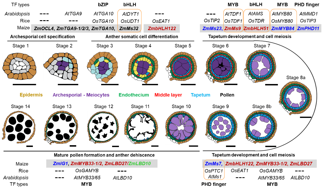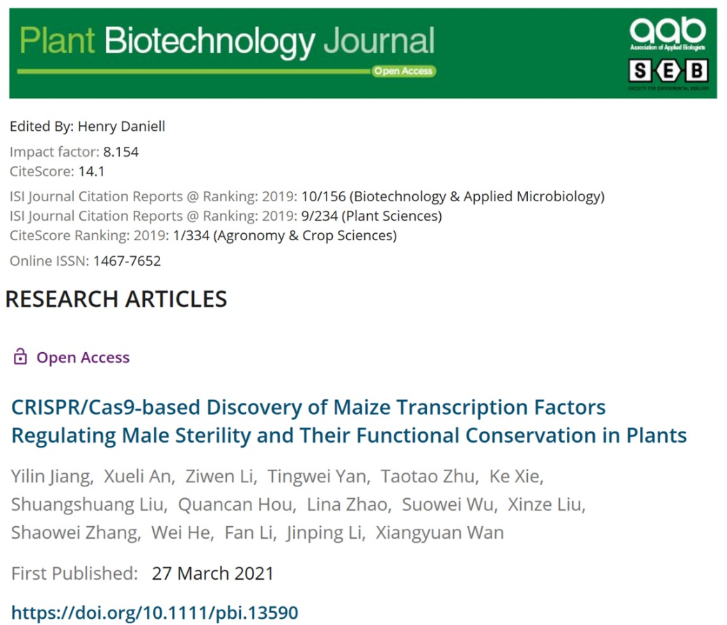 Jiang Y, An X, Li Z, Yan T, Zhu T, Xie K, Liu S, Hou Q, Zhao L, Wu S, Liu X, Zhang S, He W, Li F, Li J, Wan X. 2021. CRISPR/Cas9-based Discovery of Maize Transcription Factors Regulating Male Sterility and Their Functional Conservation in Plants. Plant Biotechnology Journal 19, doi.org/10.1111/pbi.13590.