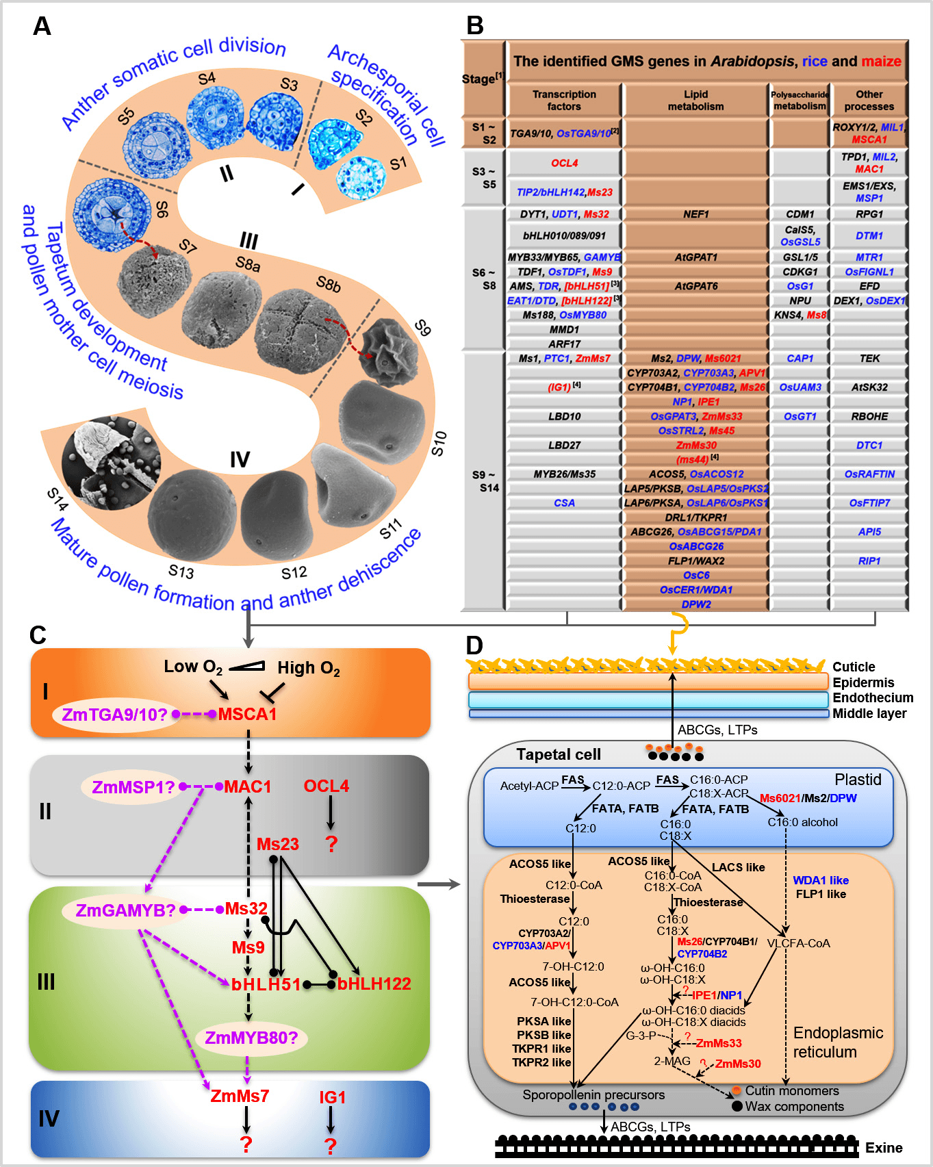 1:玉米花药和花粉发育的14个时期、GMS基因功能分类和控制雄花发育的遗传调控网络(图A-BST不育英文“Sterility”的缩写)