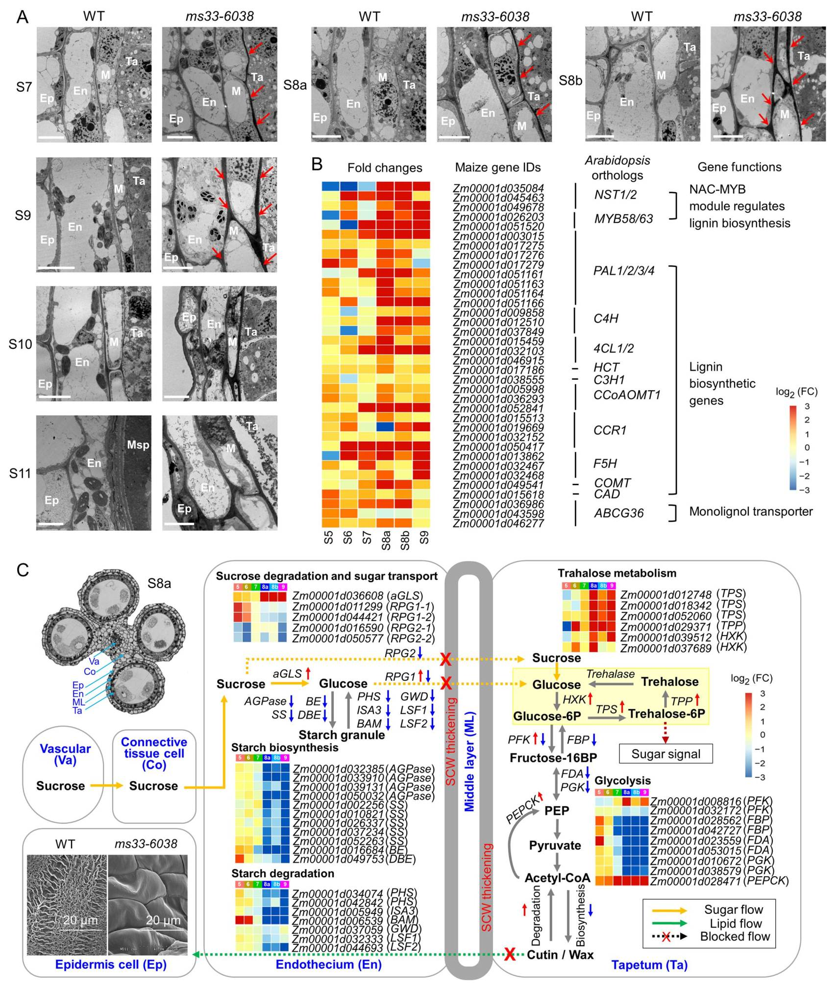 然后,针对差异表达基因也富集于细胞壁物质合成等途径,通过细胞学观察、对细胞壁木质素合成、转运和调控等途径的基因进行表达分析,发现ms33-6038花药中间层细胞至少在S7时期开始发生次生细胞壁加厚,且加厚程度随花药发育愈发严重(图3AB)。鉴于细胞壁结构对植物细胞生长和细胞间物质运输的重要性,推断ms33-6038花药中间层细胞异位、过早和严重的次生加厚不仅可在结构上阻碍细胞的膨大和伸长,并且可通过阻碍花药壁内皮层和绒毡层细胞间糖类和脂类的运输供给(图3C),加重饥饿胁迫、代谢重排和细胞自噬,最终阻碍花药细胞伸长和过早的凋亡。