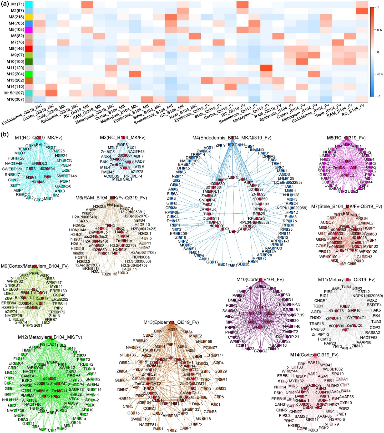 图3. 玉米根尖7种主要细胞类型中响应Fv侵染共表达调控模块和关键网络
