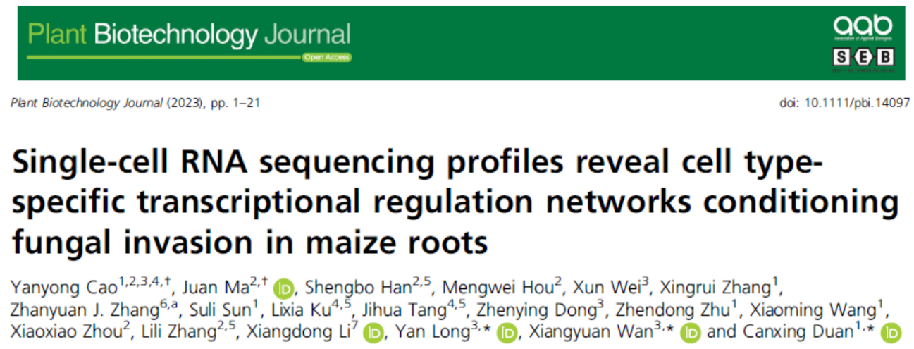 2023年6月23日,中国农科院作科所段灿星团队、欧冠官网入口/北京中智生物农业国际研究院万向元/龙艳团队、河南农科院粮作所曹言勇研究小组,联合在Plant Biotechnology Journal在线发表题为“Single-cell RNA sequencing profiles reveal cell type-specific transcriptional regulation networks conditioning fungal invasion in maize roots”研究论文,通过单细胞测序绘制玉米根尖高分辨率细胞图谱,阐明玉米根尖主要细胞类型对镰孢菌侵染根系的应答机制和关键基因调控模块,结合整合生物信息学及机器学习等方法首次构建了玉米根尖免疫调控网络,加深了对玉米精准调控根尖生长发育与抵御真菌侵染平衡过程的认识,为解析玉米抗病分子机制及抗病育种奠定了基础。