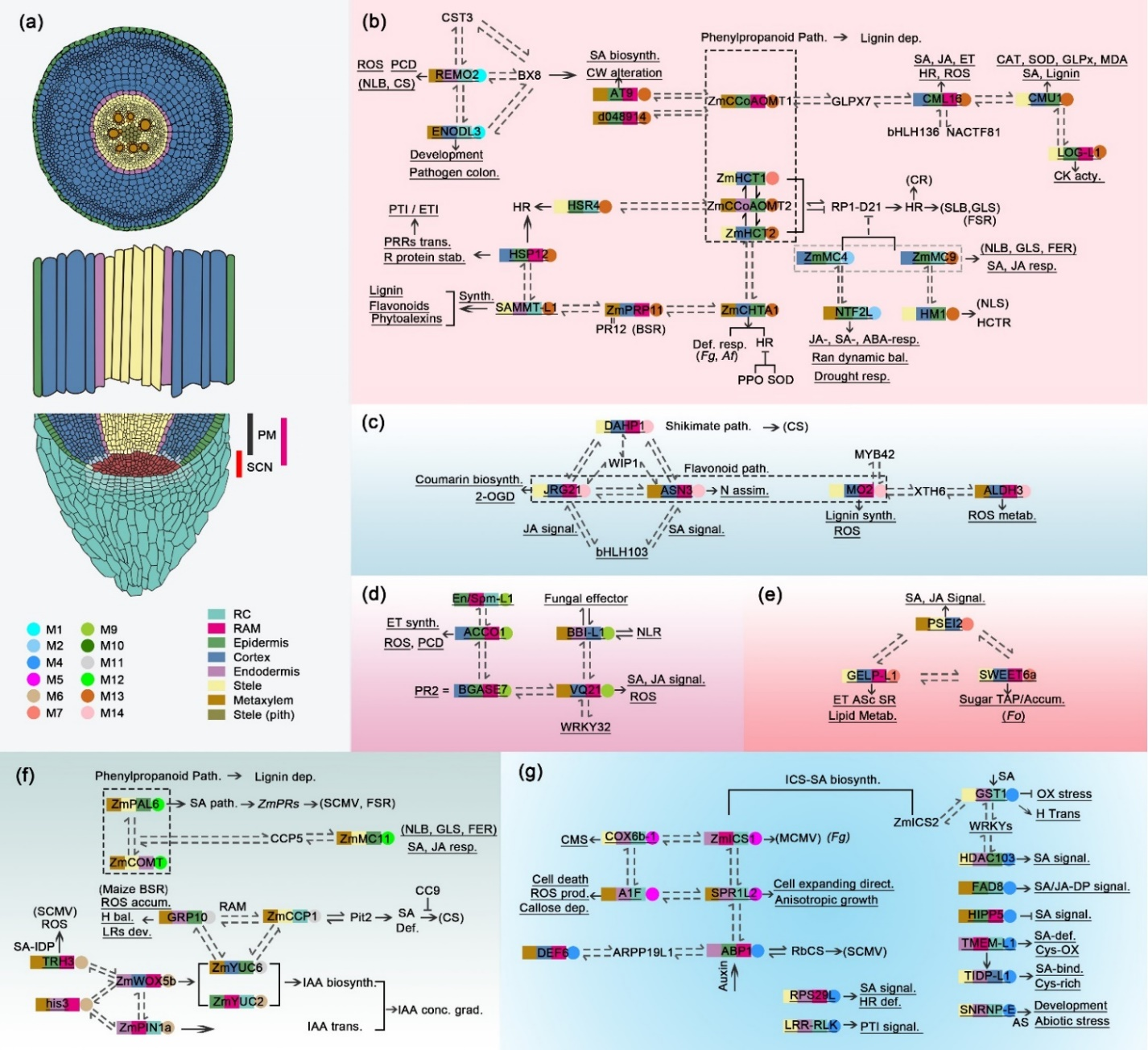 Fv侵染后,对RAM中差异表达的ZmWOX5b和ZmPIN1a基因在抗病分子信号途径中的功能进行研究,发现ZmWOX5b和ZmPIN1a通过调节IAA生物合成,从而在根尖中形成IAA浓度梯度,通过促进玉米根系伸长来保护RAM免受Fv侵染(图4)。此外,验证了苯丙烷途径相关基因(ZmPAL6, ZmCOMT和ZmCCoAOMT2)在不同细胞类型中调控木质素合成进而参与抗病防卫反应。
