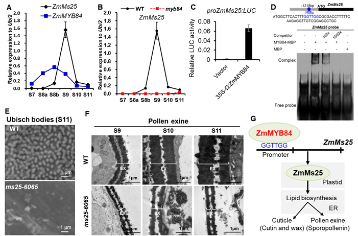 图1. ZmMYB84通过直接结合和激活ZmMs25的表达而影响玉米花药和花粉发育