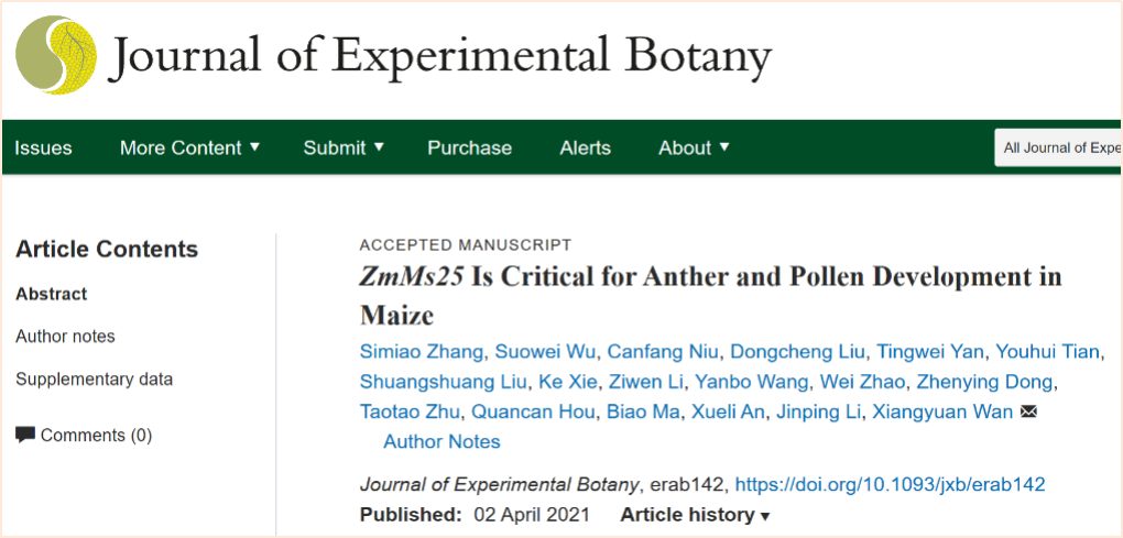 2021年04月02日,欧冠官网入口、北京中智生物农业国际研究院万向元教授团队在国际知名学术期刊Journal of Experimental Botany发表题为ZmMs25 Is Critical for Anther and Pollen Development in Maize(https://doi.org/10.1093/jxb/erab142)的研究论文,揭示了玉米雄性不育基因ZmMs25参与花药角质层和花粉外壁形成的分子调控机制。