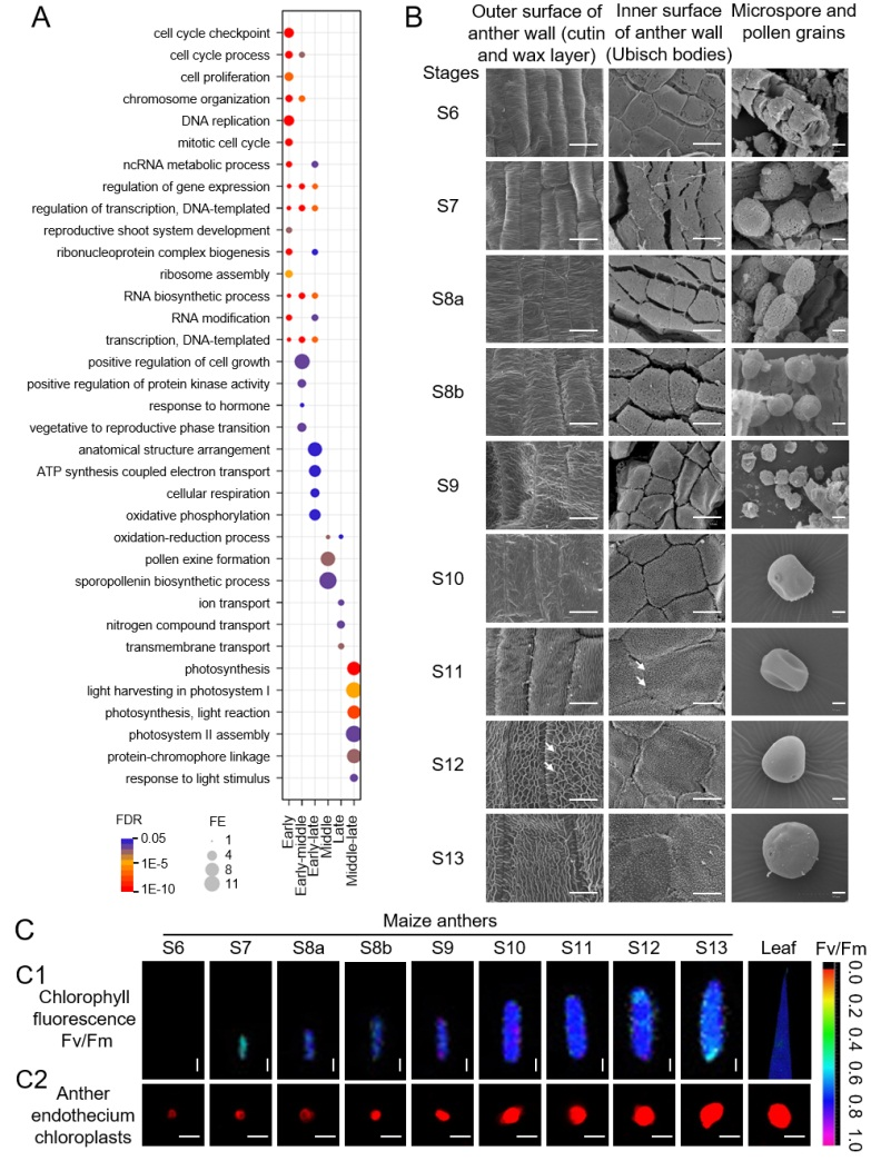 首先,该研究聚焦玉米基因组中的转录因子基因,通过分析玉米自交系W23花药12个时期的RNA-seq数据,鉴定到时期差异表达的转录因子基因1087个,采用基因表达早晚模式聚类分析把其中的1079个基因分为六类。对这六类转录因子基因及其共表达或被其调控基因的功能进行GOKEGG富集分析,发现基因表达水平变化规律与花药/花粉发育过程中细胞学和生理学变化规律具有很好的对应关系,主要包括:细胞周期和细胞有丝分裂相关基因在减数分裂前高表达,与该时期花药壁细胞和造孢细胞活跃的有丝分裂相对应;孢粉素合成和花粉壁形成相关基因以及氧化还原相关基因在减数分裂期间高表达,与该时期花粉壁形成过程以及活性氧积累诱导之后的绒毡层细胞凋亡(PCD)活动相符合;离子转运和跨膜转运相关基因在减数分裂后高表达,与减数分裂之后花药外壁角质和蜡质层以及花粉壁形成所需脂类物质的转运相对应;光合作用基因在减数分裂期间及之后高表达,与花药内皮层细胞叶绿体在减数分裂之后发育成熟,开始行使光合作用功能相一致。这是首次利用花药发育全生育期细胞学和生理学表型变化规律解释该发育过程相关基因功能的生物意义。