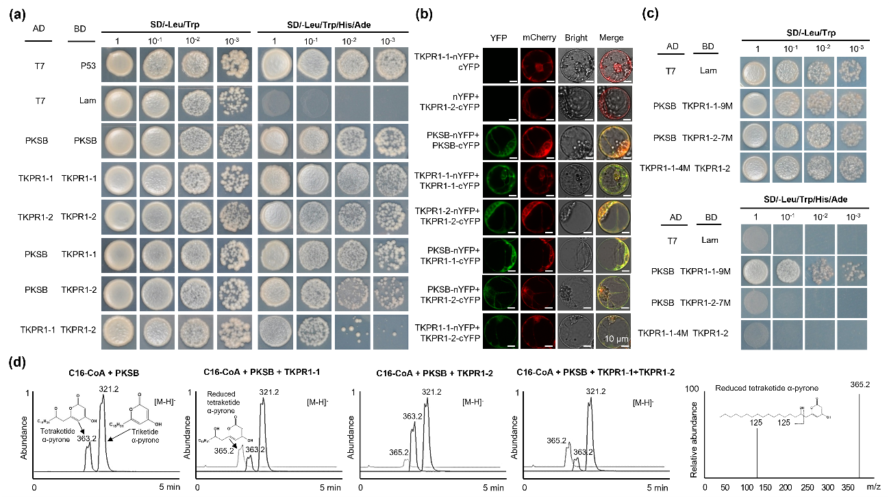 已有研究表明参与脂类合成途径的蛋白质,容易形成动态的蛋白复合体:即代谢区室(metabolon),从而高效地进行顺序酶活反应(Nakamura, 2017)。鉴于团队前期克隆的 ZmPKSB 基因(Liu et al,2022)与 ZmTKPR1-1 / -2 在花药发育过程中呈现相似的表达模式,其编码蛋白同样定位于内质网,且 pksb 突变体花粉外壁也明显变薄,并基于蛋白分子互作模拟分析,最终推测它们可能会以蛋白复合体形式在孢粉素合成中发挥作用。进一步采用蛋白结构预测、分子对接、定点突变、体内体外生化分析等多种方法证明:上述3个蛋白彼此之间均可以产生互作并形成多酶复合物(图2a, b),且以丙二酰辅酶A和中链脂肪酰辅酶为底物,进行高效地顺序酶促反应以生成还原型四酮α-吡喃酮(图2d)。由此,我们发现了首个存在于玉米花药中的孢粉素代谢区室:即ZmPKSB-ZmTKPR1-1/-2。此外,还发现对于ZmPKSB-ZmTKPR1-2ZmTKPR1-1-ZmTKPR1-2蛋白互作,分别有7个和4个氨基酸对接位点是必不可少的(图2c)。