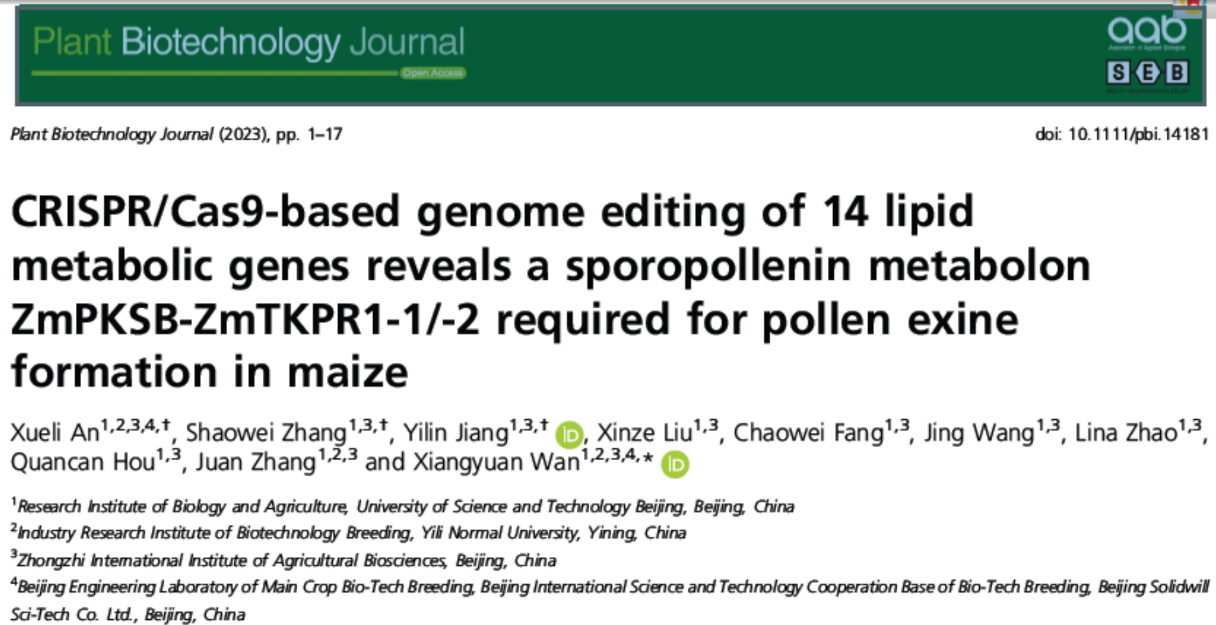 Plant Biotechnology Journal | 利用基因编辑发现脂代谢区室(ZmPKSB-ZmTKPR1-1/-2)控制玉米花粉外壁形成