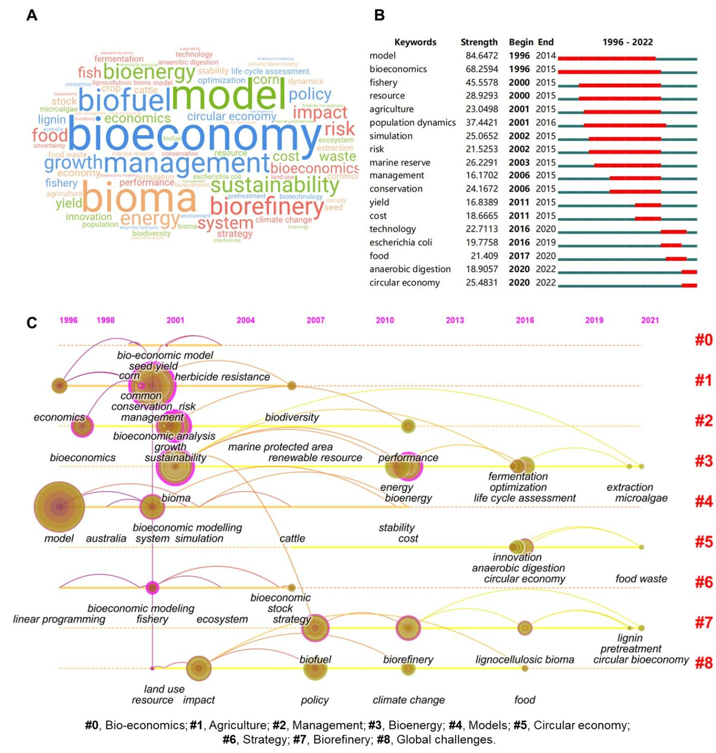 图2. 热点话题和生物经济的知识结构:(a)研究热点词云图;(b)高频关键词突现图;(c)关键词聚类时间线