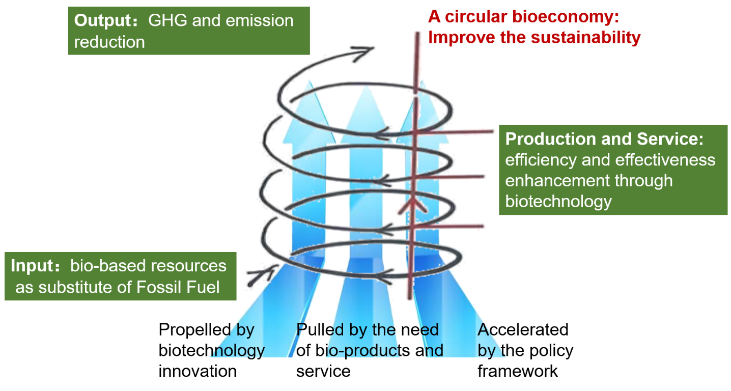 该文首先建立了“三大动力、三个特点和一个本质”的生物经济的概念模型(图1)。提出了“生物技术创新推动、国家政策引导拉动和经济社会对于生物产品及服务的需求驱动”是生物经济发展的三个动力,总结了“投入端化石能源占比降低、产出端污染物及温室气体减排和生产过程中效率提高”是生物经济最显著的三大特点,并指出生物经济本质上是“一种提高可持续性的循环经济形态”。