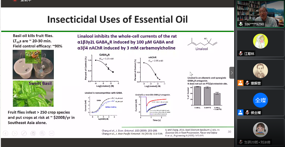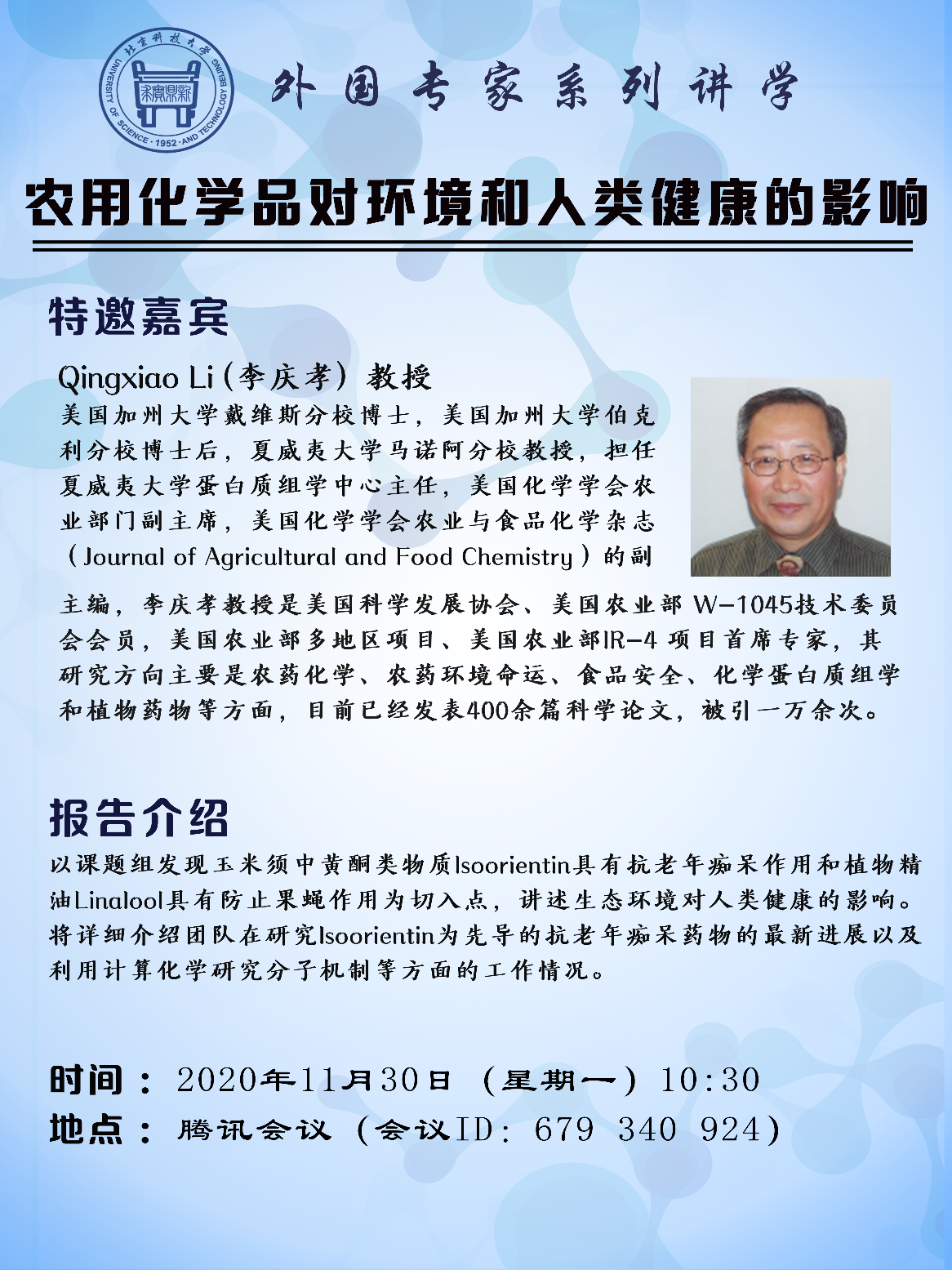 2020年11月27和30日上午,Qingxiao Li教授利用腾讯会议为大家做了题目为《科学写作与学术交流》和《人类健康与植物保护》的在线报告。Li教授首先介绍了他研究的agrochemicals,phytophamaceuticls,botanical insecticides和peroxidases四个方向。与同学们分享了读书的见解、发表好文章的基础要素、投稿注意事项,如何选刊,如何推荐审稿人以及文章题目的重要性。并从文章的主要组成部分摘要、结论、亮点、引言、结果和讨论等部分依次介绍了需要注意的事项。此外,Li教授阐述了农业化学品与环境和人类健康的关系和研究进展,介绍了分析化学、酶联免疫等在食品安全及农药残留检测中的应用并与大家讨论了海洋污染等问题。