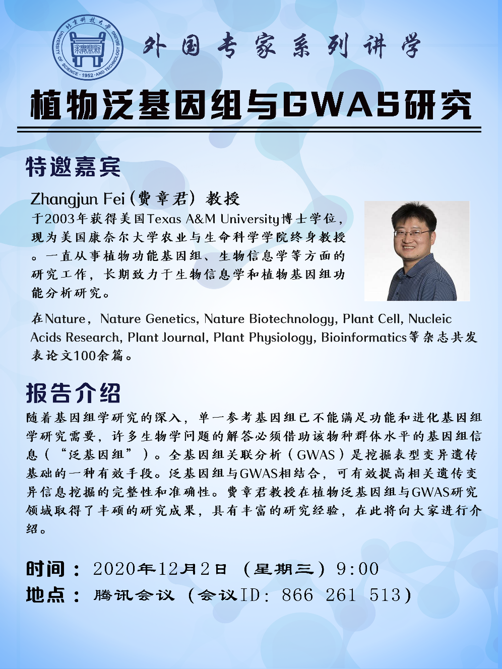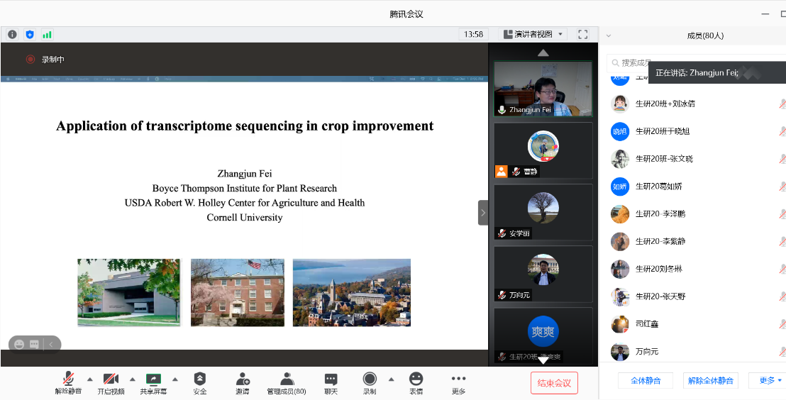 2020年12月2日和5日,Zhangjun fei教授通过腾讯会议为大家做了题为《Application of transcriptome sequencing in crop improvement》以及《Pan-genome analysis reveals gene loss during tomato domestication and uncovers a rare allele regulating fruit flavor》的报告。Fei教授介绍了自己在康奈尔大学科研团队当前的研究工作,特别是番茄泛基因组揭示了番茄新基因及调控果实风味的稀有等位基因等研究工作成果和后续进展系统阐述了转录组测序技术的研究进展及主要应用。报告中,Fei教授同我校参会师生开展了深入的学术交流指导和工作经验分享。