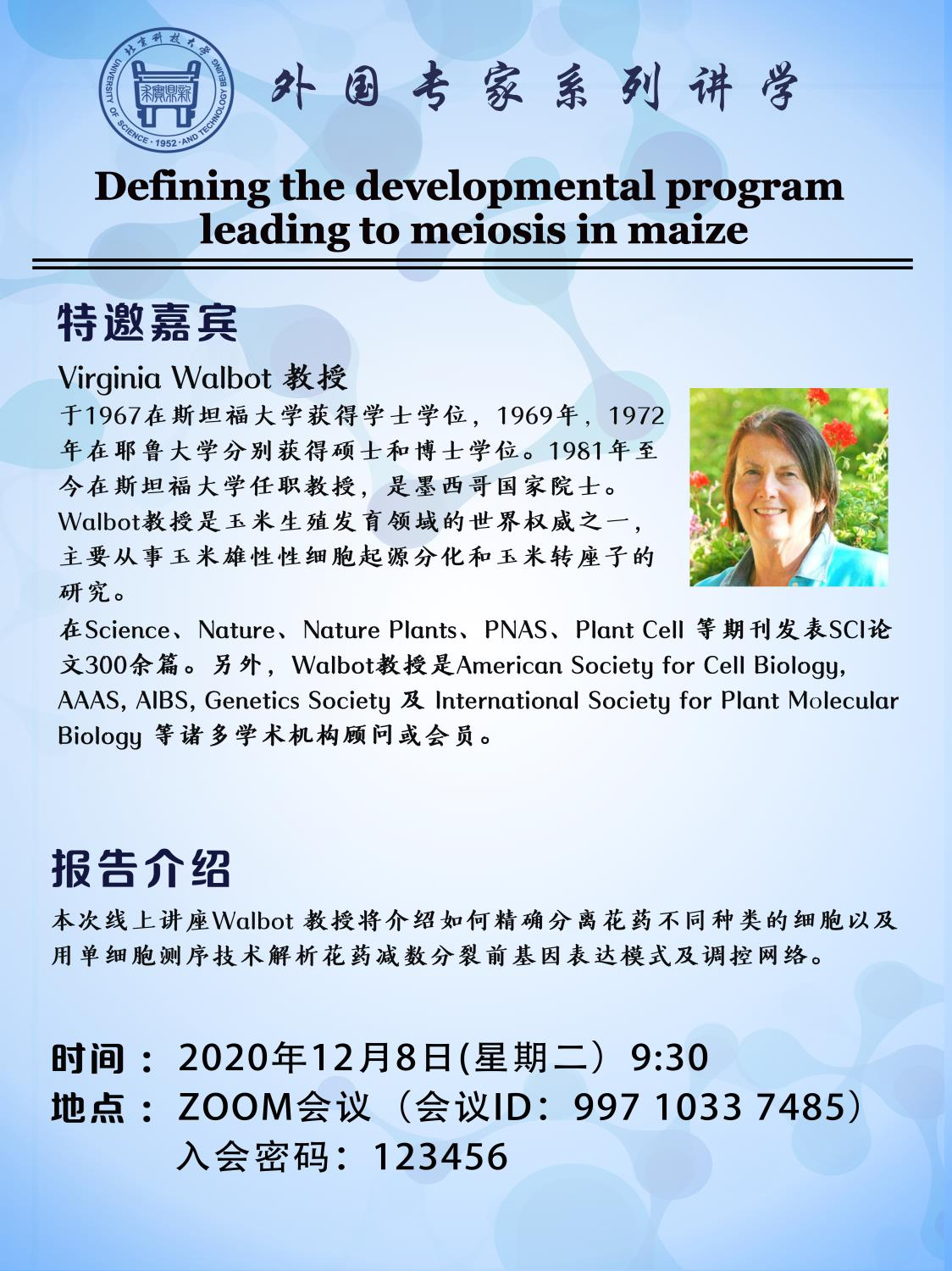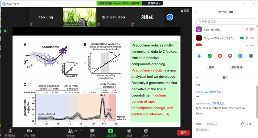 2020年12月8日,Walbot教授通过ZOOM软件为大家做了题为《利用单细胞RNA测序技术确定花药起始减数分裂的进程》,报告介绍了如何精确分离花药不同种类的单细胞并对花粉母细胞进行收集构建二代测序文库,通过单细胞RNA测序分析发现在进入减数分裂前的细线期,有一个两步的连续的基因表达转录组变化的过程。Walbot教授提出了根据“拟发育时间变化速度”进行定量评估的方式,根据基因表达的急剧改变来指示发育过程的转换,并且利用这个框架来定义生殖细胞发育过程的中间状态,本次报告Walbot介绍了他们近期在单细胞测序技术上的改进,为大家在利用单细胞转录组研究植物发育过程提供了新的指引。