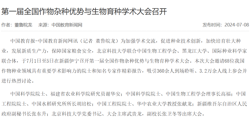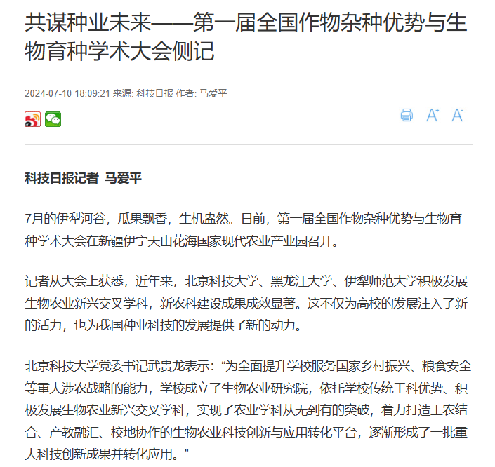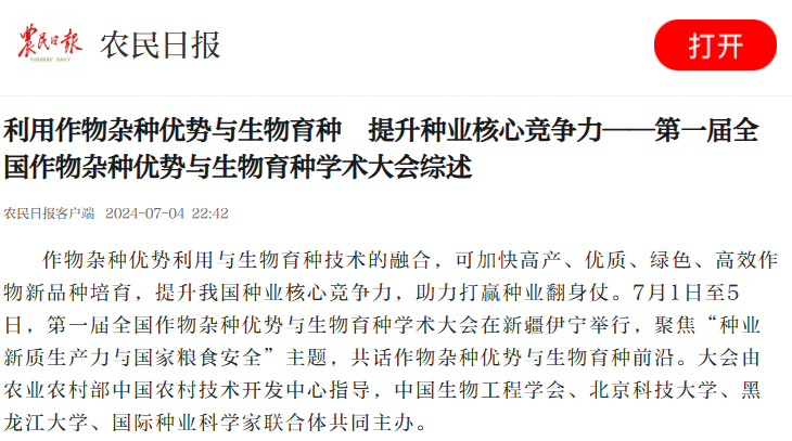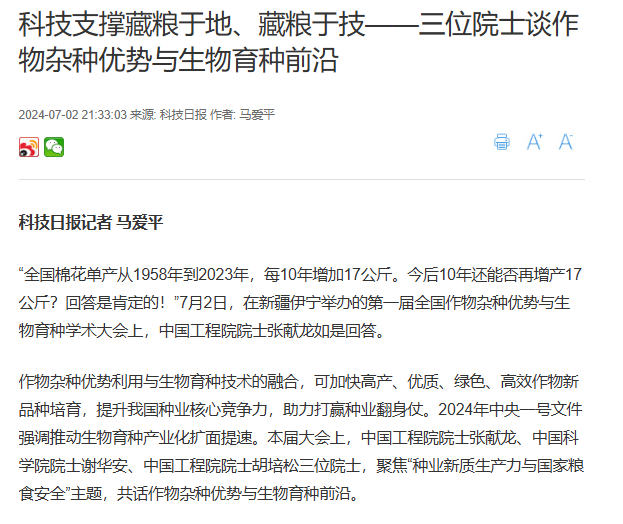 科技支撑藏粮于地、藏粮于技——三位院士谈作物杂种优势与生物育种前沿http://www.stdaily.com/index/kejixinwen/202407/cff0e791468b4ef683af0e114358f7a6.shtml